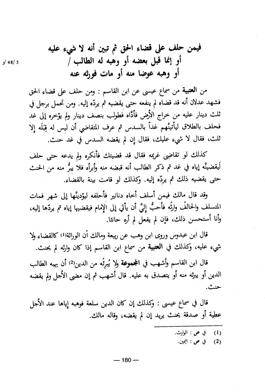 من العتيبة من سماع عيسى عن ابن القاسم: ومن حلف على قضاء الحق فشهد عدلان أنه قد قضاه لم ينفعه حتى يقضيه ثم يرده إليه. ومن تحمل برجل فى ثلث دينار عليه من خراج الأرض فأداه فطولب بنصف دينار ولم يؤخره إلى غد فحلف بالطلاق ليأتينهم غداً بالسدس ثم عرف المتقاضى أن ليس له قبله إلا ثلث، فقال لا شىء عليك، فقال إن لم يقضيه السدس فى غد حنث.