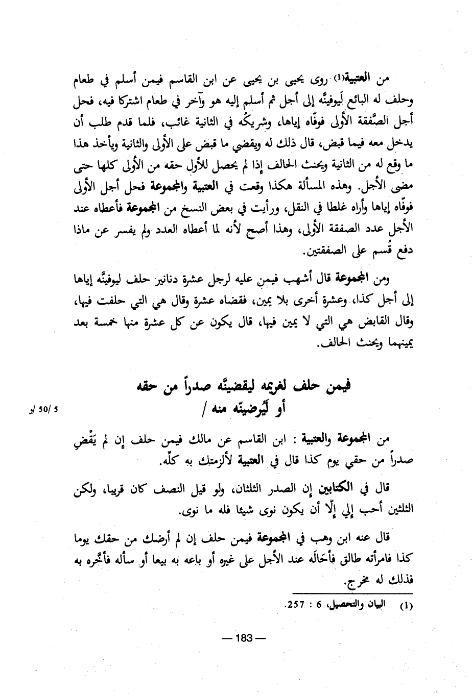 من العتبية روى يحيى بن يحيى عن ابن القاسم فيمن أسلم فى طعام وحلف له البائع ليوفينه إلى أجل ثم أسلم إليه هو وآخر فى طعام اشتركا فيه، فحل أجل الصفقة الأولى فوفاه إياها، وشريكه فى الثانية غائب، فلما قدم طلب أن يدخل معه فيما قبض، قال ذلك له ويقضى ما قبض على الأولى والثانية ويأخذ هذا ما وقع له من االثانية ويحنث الحالف إذا لم يحصل للأول حقه من الأولى كلها حتى مضى الأجل. وهذه المسألة هكذا وقعت فى العتيبة والمجموعة فحل أجل الأولى فوفاه إياها وأراه غلطاً فى النقل، ورأيت فى بعض النسخ من المجموعة فأعطاه عند الأجل عدد الصفقة الأولى، وهذا أصح لأنه لما أعطاه العدد ولم يفسر عن ماذا دفع قسم إلى الصفقتين.