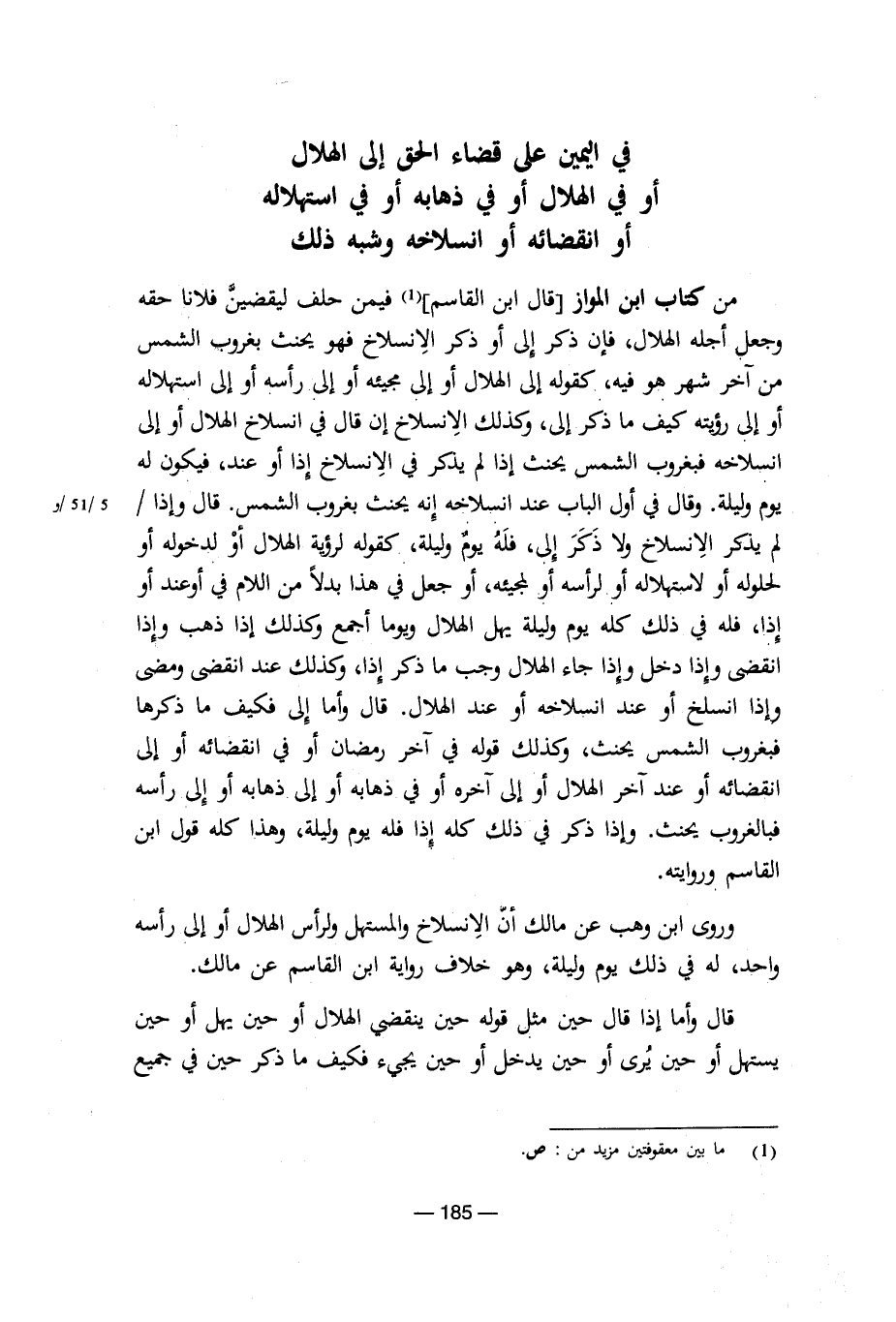 من كتاب ابن المواز قال ابن القاسم فيمن حلف ليقضين فلانا حقه وجعل أجله الهلال، فإن ذكر إلى أو ذكر الانسلاخ فهو يحنث بغروب الشمس من آخر شهر هو فيه، كقوله إلى الهلال أو إلى مجيئه أو إلى رأسه أو إلى استهلاله أو إلى رؤيته كيف ما ذكر إلى، زكذلك الانسلاخ إن قال فى انسلاخ الهلال أو إلى انسلاخه فبغروب الشمس يحنث إذا لم يذكر فى الانسلاخ إذا أو عند، فيكون له يوم وليلة. وقال فى أول الباب عند انسلاخه إنه يحنث بغروب الشمس. قال وإذا لم يذكر الانسلاخ ولا ذكر إلى، فله يوم وليلة، كقوله لرؤية الهلال أو لدخوله أو لحلوله أو لاستهلاله أو لرأسه أو لمجيئه، أو جعل فى هذا بدلاً من الللام فى أو عند أو إذا، فله فى ذلك كله يوم وليلة يهل الهلال ويوما أجمع وكذلك أذا ذهب وإذا انقضى وإذا دخل وإذا جاء الهلال وجب ما ذكر إذا، وكذلك عند انقضى ومضى وإذا انسلخ أو عند انسلاخه أو عند الهلال. قال وأما إلى فكيف ما ذكرها فبغروب الشمس يحنث، وكذلك قوله فى آخر رمضان أو فى انقضائه أو إلى انقضائه أو عند آخر الهلال أو إلى آخره أو فى ذهابه أو إلى ذهابه أو إلى رأسه فبالغروب يحنث. وإذا ذكر فى ذلك كله إذا فله يوم وليلة، وهذا كله قول ابن القاسم وروايته.