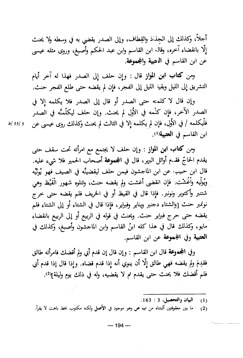 ومن كتاب ابن المواز: وإن حلف لا يجتمع مع امرأته تحت سقف حتى يقدم الحاج فقدم أوائل البربر، قال فى المجموعة أصحاب الحمير فلا شىء عليه. قال ابن حبيب عن ابن الماجشون فيمن حلف ليقضنه فى الصيف فهو يونية ويوليه وأغشت. فإن انقضى أغشت ولم يقضه حنث، وتتلوه شهور القيظ وهى شتنبر واكتوبر ونونبر. فإذا قال فى القيظ أو فى الخريف فلم يقضه حتى خرج نوفمبر حنث والشتاء دجنبر ويناير وفبراير، فغذا قال فى الشتاء أو إلى فلم يقضه حتى خرج فبراير حنث. ويحنث فى قوله فى الربيع أو إلى الربيع بانقضاء مايو، وكذلك قال فى هذا كله ابن القاسم وابن الماجشون وأصبغ، وكذلك فى العتبية وفى المجموعة عن ابن القاسم.