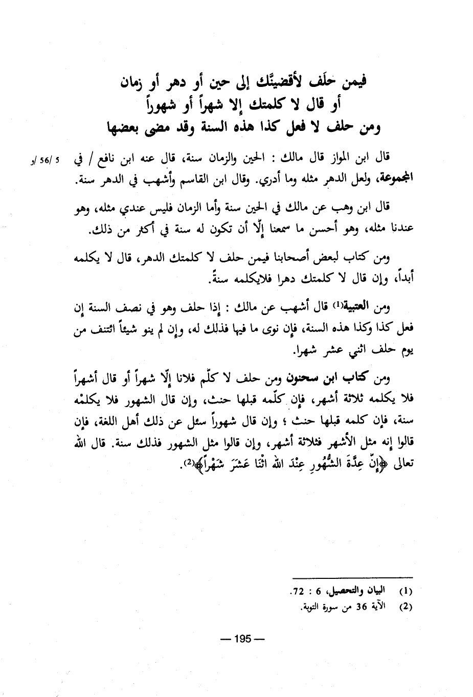 ومن كتاب ابن سحنون ومن حلف لا كلم فلانا إلا شهرا أو قال أشهرا فلا يكلمه ثلاثة أشهر، فإن كلمه قبلها حنث، وإن قال الشهور فلا يكلمه سنة، فإن كلمه قبلها حنث؛ وإن قال شهوراً سئل عن ذلك أهل اللغة، فإن قالوا إنه مثل الأشهر فثلاثة أشهر، وإن قالوا مثل الشهور فذلك سنة. قال الله تعالى (إن عدة الشهور عند الله اثنا عشر شهراً).