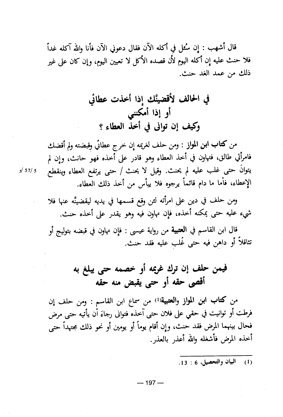 من كتاب ابن المواز والعتبية من سماع ابن القاسم: ومن حلف إن فرطت أو توانيت فى حقى على فلان حتى آخذه فتوانى رجاء أن يأتيه حتى مرض فحال بينهما المرض فقد حنث، وإن أقام يوماً أو يومين أو نحو ذلك مجتهداً حتى اخذه المرض فأشغله والله أعذر بالعذر.