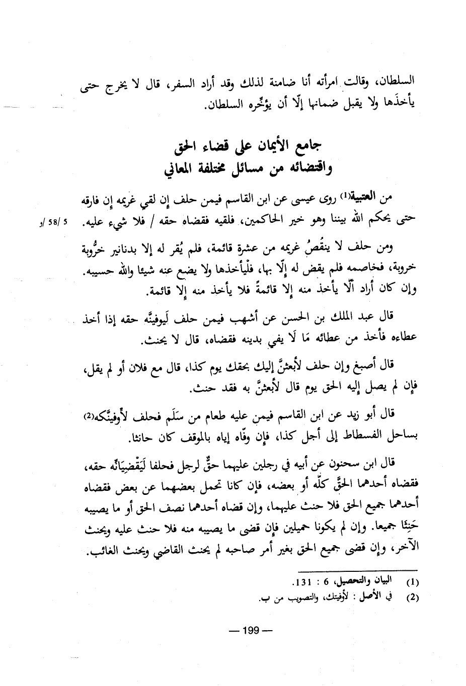 قال ابن سحنون عن أبيه فى رجلين عليهما حق لرجل فحلف ليقضيانه حقه، فقضاه أحدهما الحق كله أو بعضه، فإن كان تحمل بعضهما عن بعض فقضاه أحدهما جميع الحق فلا حنث عليهما، وإن قضاه أحدهما نصف الحق أو ما يصيبه حنثا جميعا. وإن لم يكونا حميلين فإن قضى ما يصيبه منه فلا حنث عليه ويحنث الآخر، وإن جميع الحق بغير أمر صاحبه لم يحنث القاضى ويحنث الغائب.