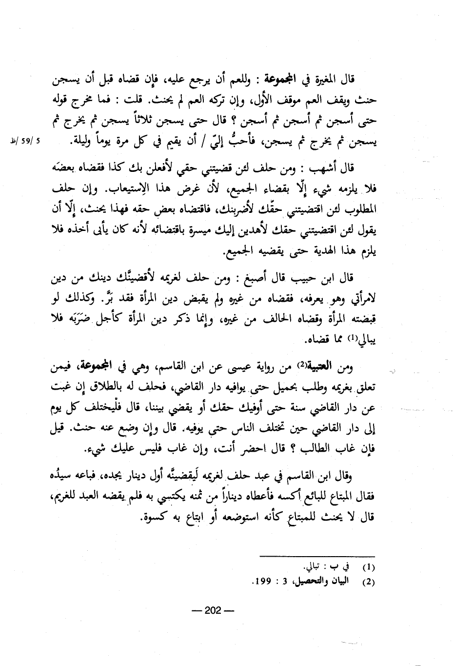 قال المغيرة فى المجموعة: وللعم أن يرجع عليه، فإن قضاه قبل أن يسجن حنث ويقف العم موقف الأول، وإن تركه العم لم يحنث. قلت: فما مخرج قوله حتى أسجن ثم أسجن ثم أسجن؟ قال حتى يسجن ثلاثاًيسجن ثم يسجن ثم يخرج ثم يسجن، فأحب إلى أن يقيم فى كل مرة يوماً وليلة.