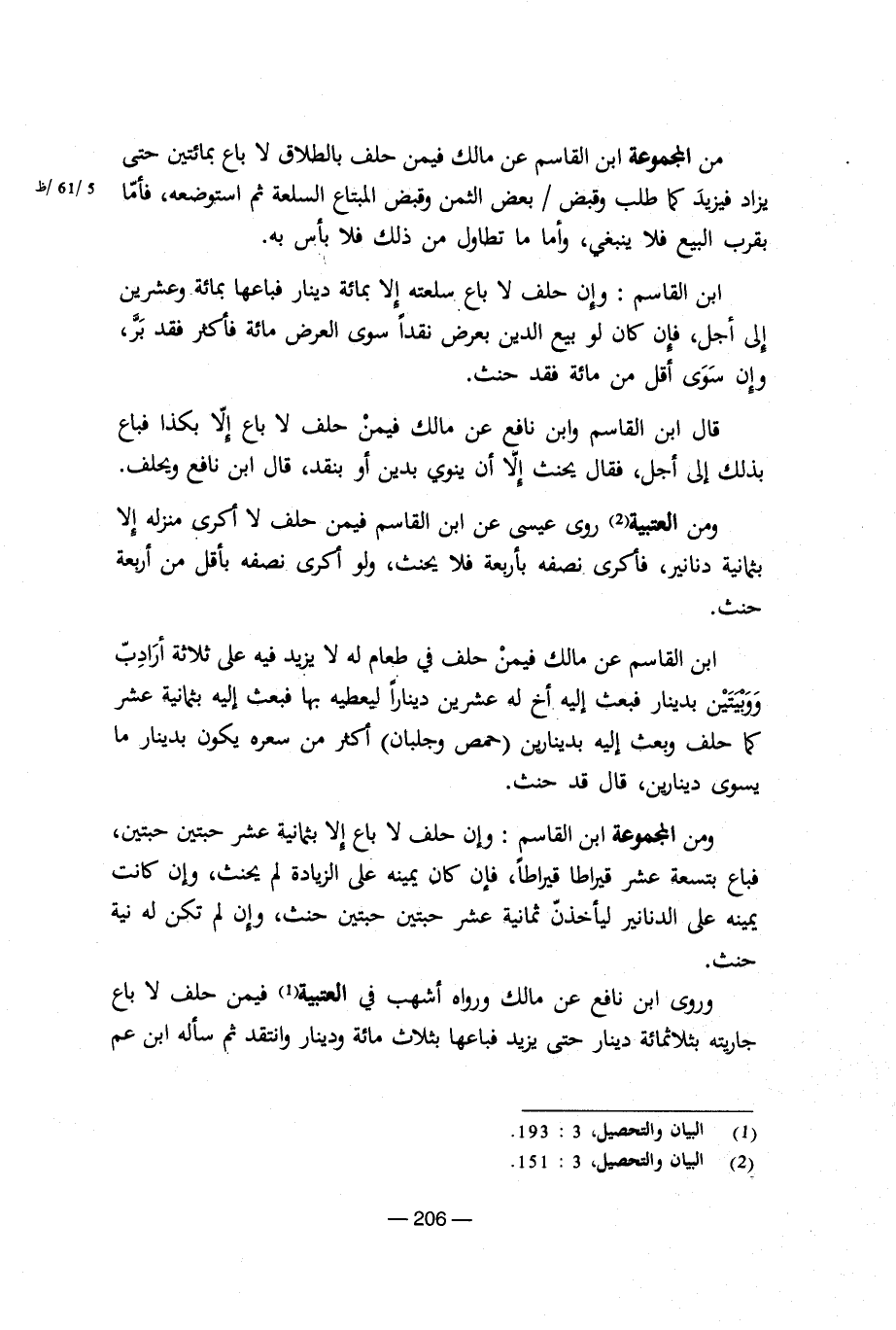ومن المجموعة ابن القاسم: وإن حلف لا باع إلا بثمانية عشر حبتين حبتين، فباع بتسعة عشر قيراطا قيراطاً، فإن كان يمينه على الزيادة لم يحنث وإن كانت يمينه على الدنانير ليأخذن ثمانية عشر حبتين حبتين حنث، وإن لم تكن له نية حنث.