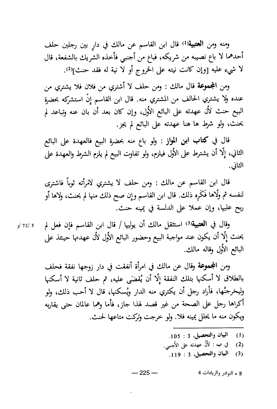 ومنه ومن العتبية قال ابن القاسم عن مالك فى دار بين رجلين حلف أحدهما لا باع نصيبه من شريكه، فباع من أجنبى فأخذه الشريك بالشفعة، قال لا شىء عليه وإن كانت نيته على الخروج او لا نية له فقد حنث.
