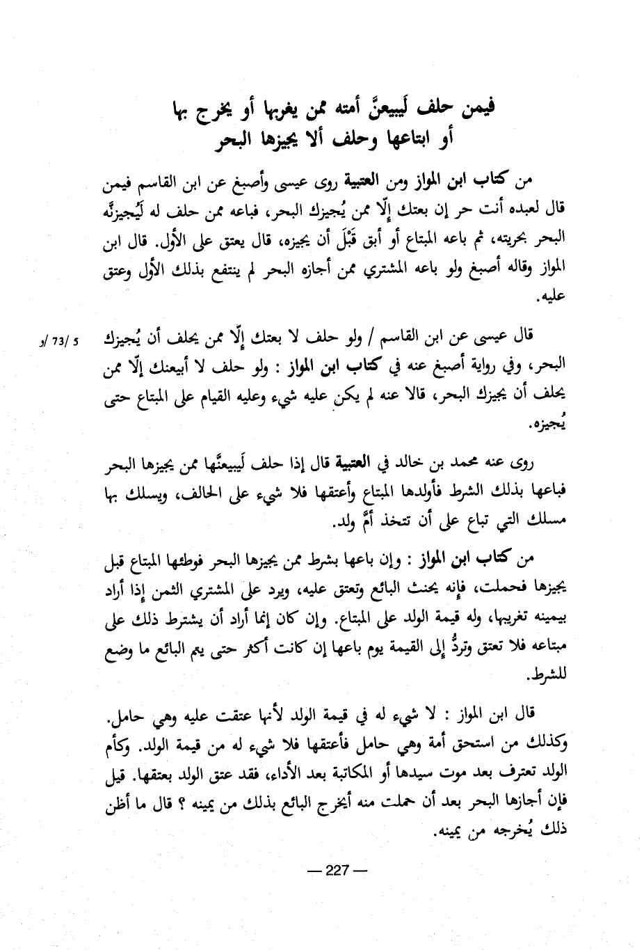 روى عنه محمد بن خالد فى العتبية قال إذا حلف ليبيعنها ممن يجيزها البحر فباعها بذلك الشرط فأولدها المبتاع وأعتقها فلا شىء على الحالف، ويسلك بها مسلك التى تباع على أن تتخذ أم ولد.