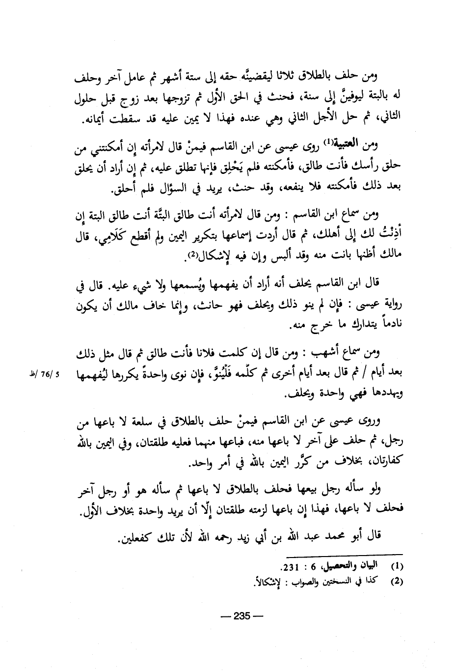 ومن سماع ابن القاسم: ومن قال لامرأته أنت طالق البتة أنت طالق البتة إذ أذنت لك إلى أهلك، ثم قال أردن إسماعها بتكرير اليمين ولم أقطع كلامى، قال مالك أظنها بانت منه وقد ألبس وإن فيه لإشكال.