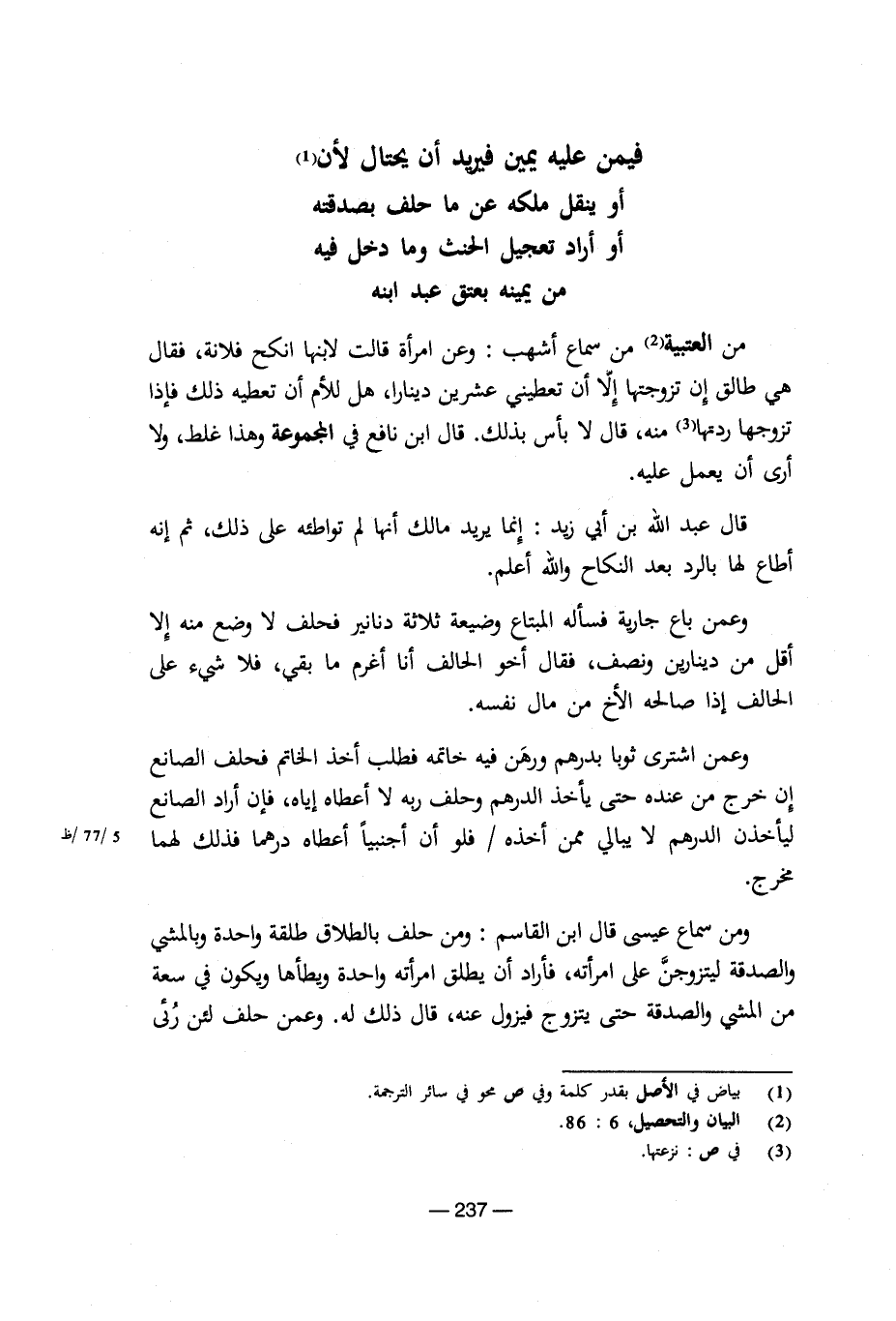 من العتبية من سماع أشهب: عن امرأة قلت لابنها انكح فلانة، فقال هى طالق إن تزوجتها إلا أن تعطينى عسرين دينارا، هل للأم أن تعطيه ذلك فإذا تزوجها ردتها منه، قال لا بأس بذلك. قل ابن نافع فى المجموعة وهذا غلط، ولا أرى أن يعمل عليه.