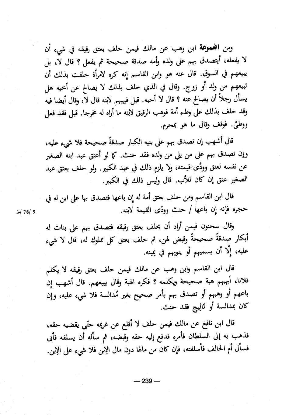 ومن المجموعة ابن وهب عن مالك فيمن حلف بعتق رقيقه فى شىء أن لا يفعله، أيتصدق بهم على ولده وأمه صدقة صحيحة ثم يفعل؟ قال لا، بل يبيعهم فى السوق. قال عنه هو وابن القاسم إن كرهه لامرأة حلفت بذلك أن تبيعهم من ولد أو زوج. وقال فى الذى حلف بذلك لا يصالح عن أخيه هل يسأل رجلاً أن يصالح عنه؟ قال لا أحبه. قيل فيهبهم لابنه قال لا، وقال أيضا فيه وقد حلف بذلك على وطء أمة فوهب الرقيق لابنه ما أراه له مخرجا. قيل فقد فعل ووطىء. فوقف وقال ما هو بمحرم.