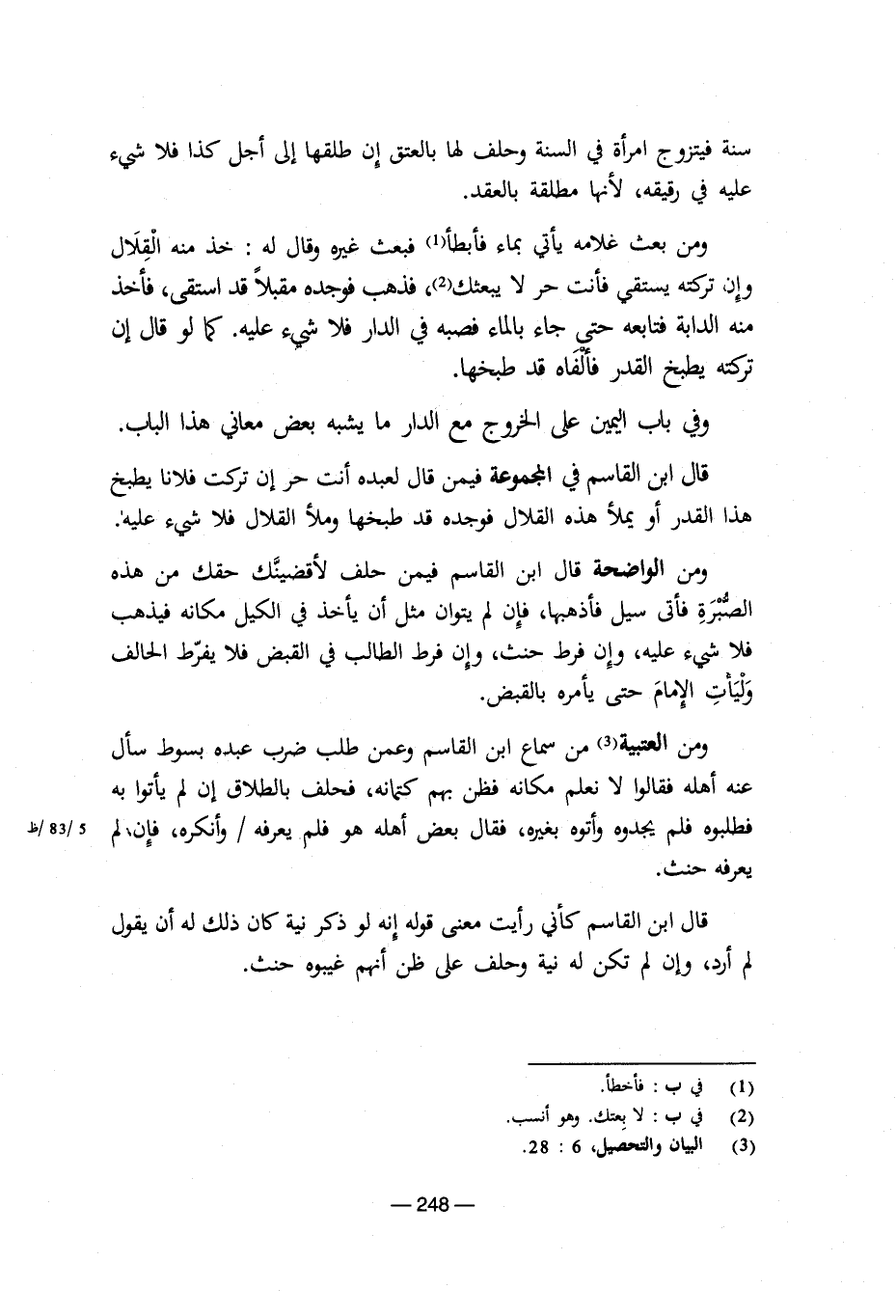 ومن العتبية من سماع ابن القاسم وعمن طلب ضرب عبده بسوط سأل عنه أهله فقالوا لا نعلم مكانه فظن بهم كتمانه، فحلف بالطلاق إن لم يأتو به فطلبوه فلم يجدوه وأتوه بغيره، فقال أهله هو فلم يعرفه وأنكره، فإن لم يعرفه حنث.