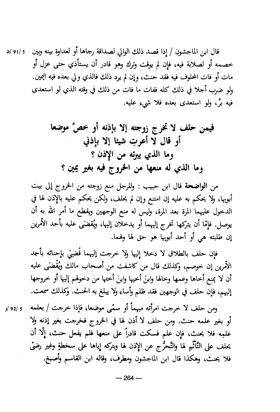 من الواضحة قال ابن حبيب: وللرجل منع زوجته من الخروج إلى بيت أبويها، ولا يحكم به عليه إن امتنع وإن لم يحلف، ولكن يحكم عليه بالإذن لها فى الدخول عليهما المرة بعد المرة، وليس له منع الوجهين ويقطع ما أمر الله به أن يوصل. فإما أن يتركها تخرج إليهما أو يدخلان إليها، ويقضى عليه بأحد الأمرين إن طلبته هى أو أحد أبويها هو حق لها ولهما.