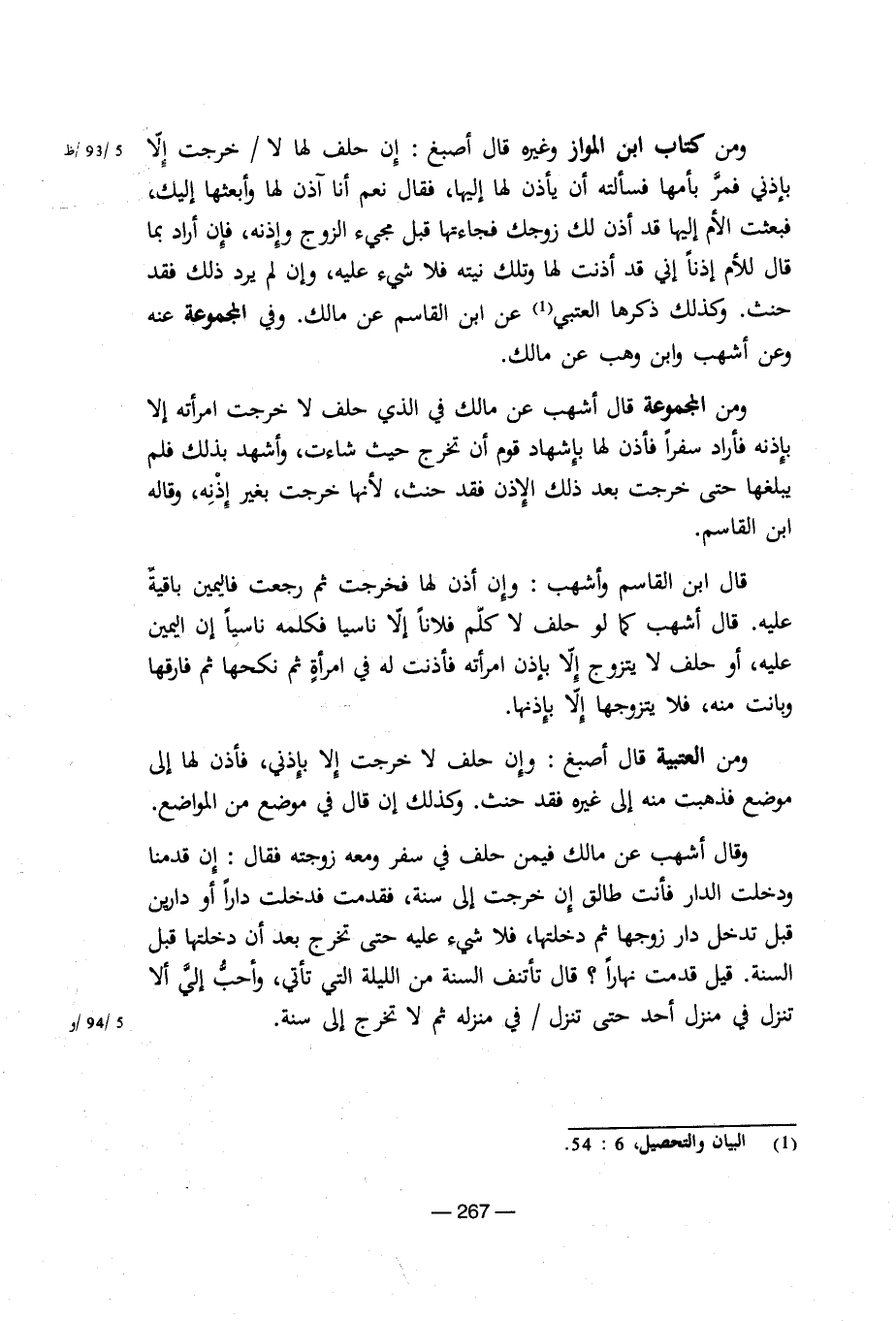 ومن العتبية قال أصبغ: وإن حلف لا خرجت إلا بإذنى، فأذن لها إلى موضع فذهبت منه إلى غيره فقد حنث. وكذلك إن قال فى موضع من المواضع. وقال أشهب عن مالك فيمن حلف فى سفر ومعه زوجته فقال: إن قدمنا ودخلت الدار فأنت طالق إن خرجت إلى سنة، فقدمت فدخلت داراً أو دارين قبل تدخل دار زوجها ثم دخلتها، فلا شىء عليه حتى تخرج بعد أن دخلتها قبل السنة. قيل قدمت نهاراً؟ قال تأتنف السنة من الليلة التى تأتى، وأحب إلى ألا تنزل فى منزل أحد حتى تنزل فى منزله ثم لا تخرج إلى سنة.