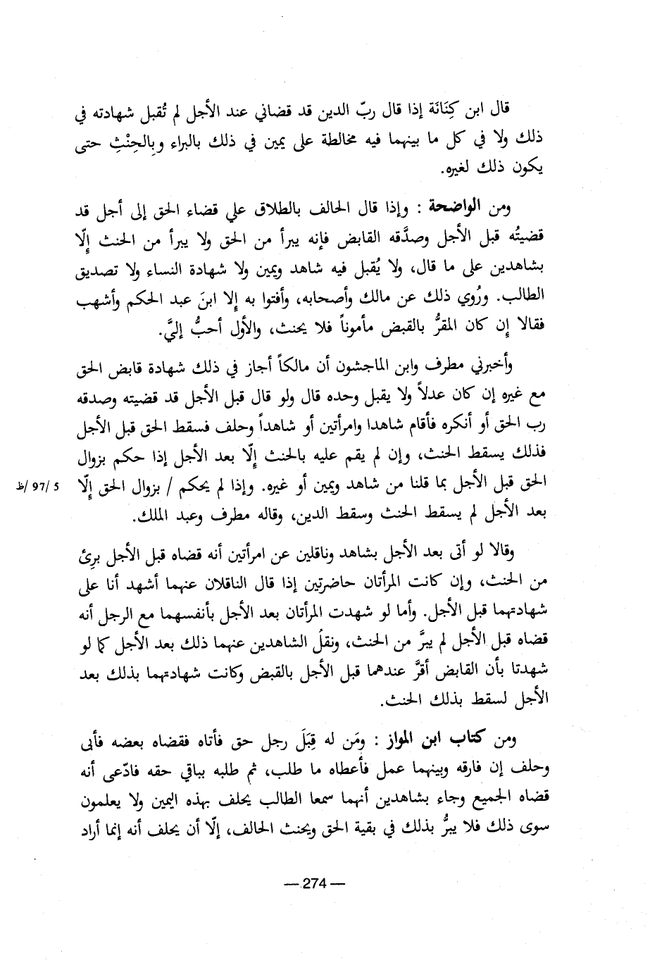 ومن الواضحة: وإذا قال الحالف بالطلاق على قضاء الحق إلى أجل قد قضيته قبل الأجل وصدقه القابض فإنه يبرأ من الحق ولا يبرأ من الحنث إلا بشاهدين على ما قال، ولا يقبل فيه شاهد ويمين ولا شهادة النساء ولا تصديق الطالب. وروى ذلك عن مالك وأصحابه، وأفتوا به إلا ابن عبد الحكم وأشهب فقالا إن كان المقر بالقبض مأموناً فلا يحنث، والأول أحب إليه.