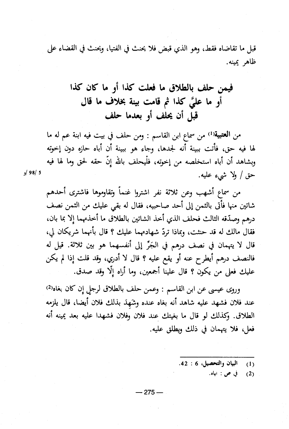 من سماع أشهب وعن ثلاثة نفر اشتروا غنماً وتقاوموها فاشترى أحدهم شاتين منها فأتى بالثمن إلى أحد صاحبيه، فقال له بقى عليك من الثمن نصف درهم وصدقه الثالث فحلف الذى أخذ الشاتين بالطلاق ما أخذتهما إلا بما بان، فقال مالك له قد حنثت، وبماذا ترد شهادتهما عليك؟ قال بأنهما شريكان لى، قال لا يتهمان فى نصف درهم فى الجر إلى أنفسهما هو بين ثلاثة. قيل له فالنصف درهم أيطرح عنه أو يقع عليه؟ قال لا أدرى، وقد قلت إذا لم يكن عليك فعلى من يكون؟ قال علينا أجمعين، وما أراه إلا وقد صدق.