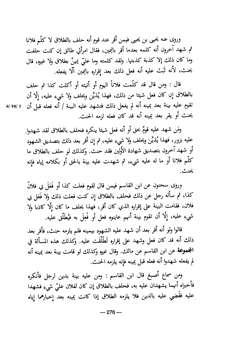 ومن شهد عليه قوم بحق أو أنه فعل شيئا ينكره فحلف بالطلاق لقد شهدوا عليه بزور، فهذا يدين ويحلف ولا شىء عليه، ثم إن أقر بعد ذلك بتصديق الشهود أو شهد آخرون بتصديق شهادة الأولين فقد حنث. وكذلك لو حلف بالطلاق ما كلم فلانا أو ما له عليه شىء، ثم شهدت عليه بينة بالحق أو بكلامه إياه فإنه يحنث.