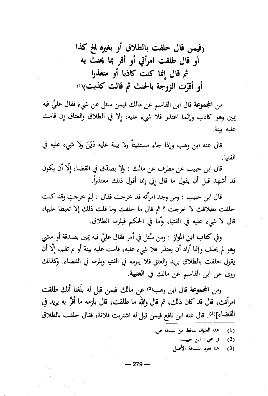 ومن المجموعة قال ابن وهب عن مالك فيمن قيل له بلغنا أنك طلقت امرأتك قال قد كنت ذلك، ثم قال والله ما طلقت، قال يلزمه ما أقر به يريد فى القضاء. قال عنه ابن نافع فيمن قيل له اشتريت فلانة، فقال حلف بالطلاق