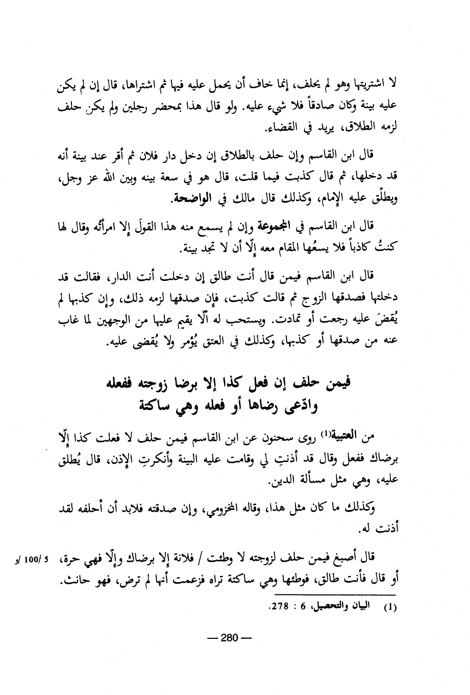 من العتبية روى سحنون عن ابن القاسم فيمن حلف لا فعلت كذا إلا برضاك ففعل وقال قد أذنت لى وقامت عليه البينة وأنكرت الإذن، قال يطلق عليه، وهى مثل مسألة الدين.