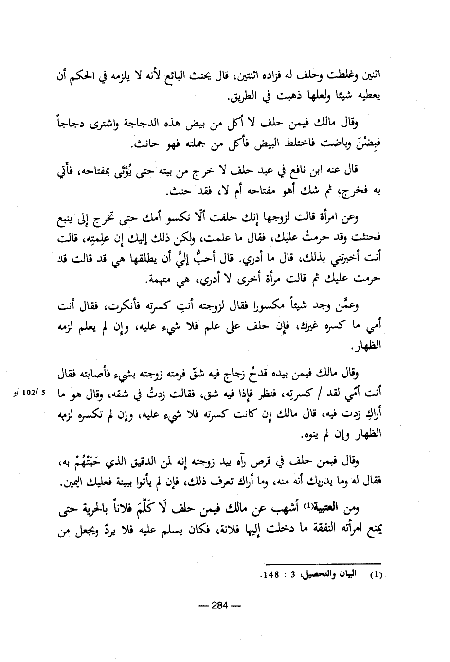 ومن العتبية أشهب عن مالك فيمن حلف لا كلم فلاناً بالحرية حتى يمنع امرأته النفقة ما طخلت إليها فلانة، فكان يسلم عليه فلا يرد ويجعل من