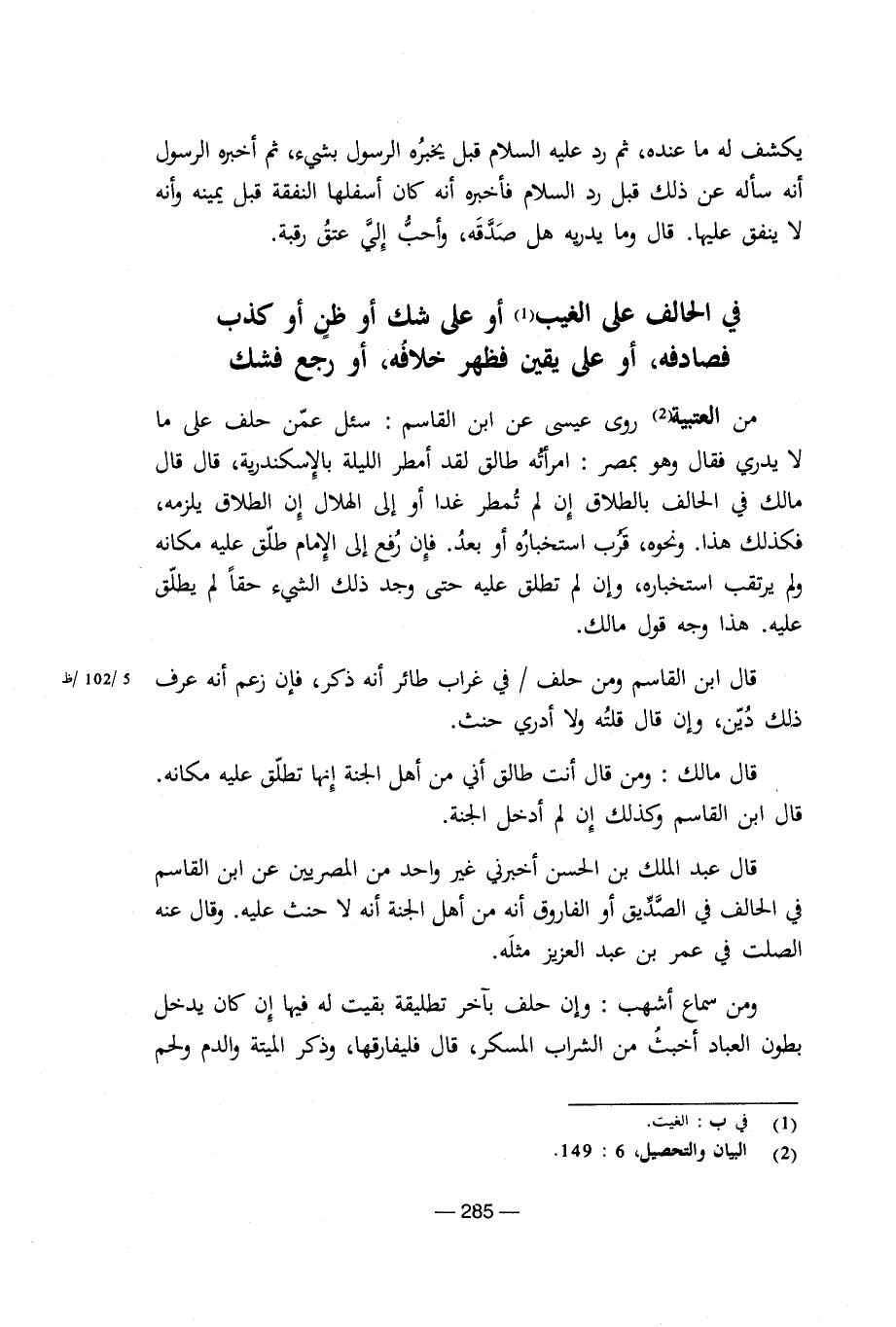 من العتبية روى عيسى عن ابن القاسم: سئل عمن حلف على ما لا يدرى فقال وهو بمصر: امرأته طالق لقد أمطر الليلة بالإسكندرية، قال قال مالك فى الحالف بالطلاق إن لم تمطر غدا أوإلى الهلال إن الطلاق يلزمه، فكذلك هذا. ونحوه، قرب استخباره أو بعد. فإن رفع إلى الإمام طلق عليه مكانه ولم يرتقب استخباره، وإن لم تطلق عليه حتى وجد ذلك الشىء حقاً لم يطلق عليه. هذا وجه قول مالك.