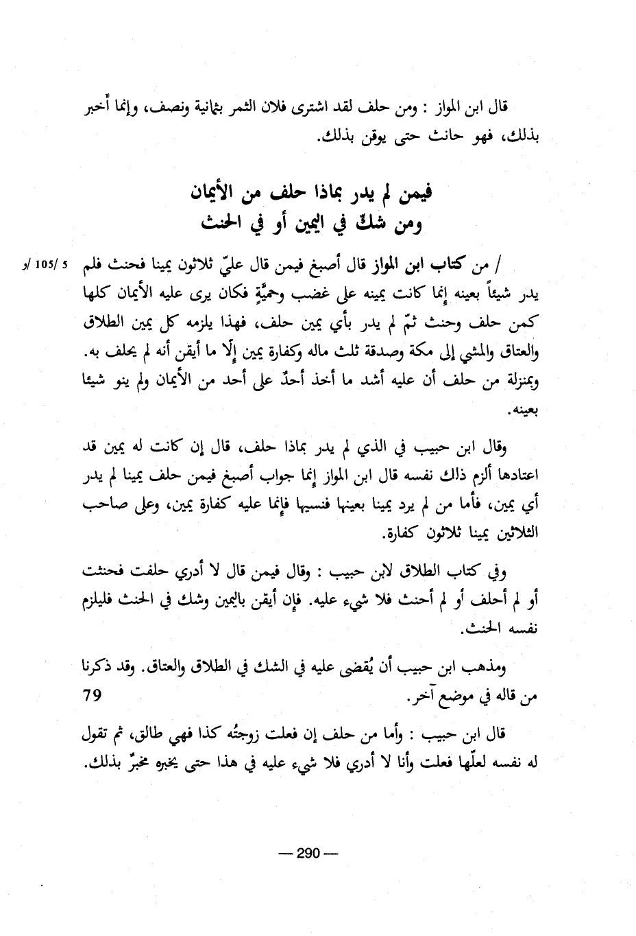 وفى كتاب الطلاق لابن حبيب: وقال فيمن قال لا أدرى حلفت فحنث أو لم أحلف أو لم أحنث فلا شىء عليه. فإن أيقن باليمين وشك فى الحنث فليلزم نفسه الحنث.
