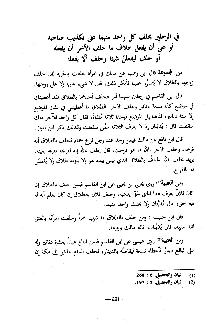 ومن العتبية روى يحيى بن يحيى عن ابن القاسم فيمن حلف بالطلاق غن كان فلان يعرف هذا الحق لحق الذى يدعيه، وحلف فلان بالطلاق إن كان يعلم أنه له فيه حق، قال يدينان ولا يحنث واحد منهما.