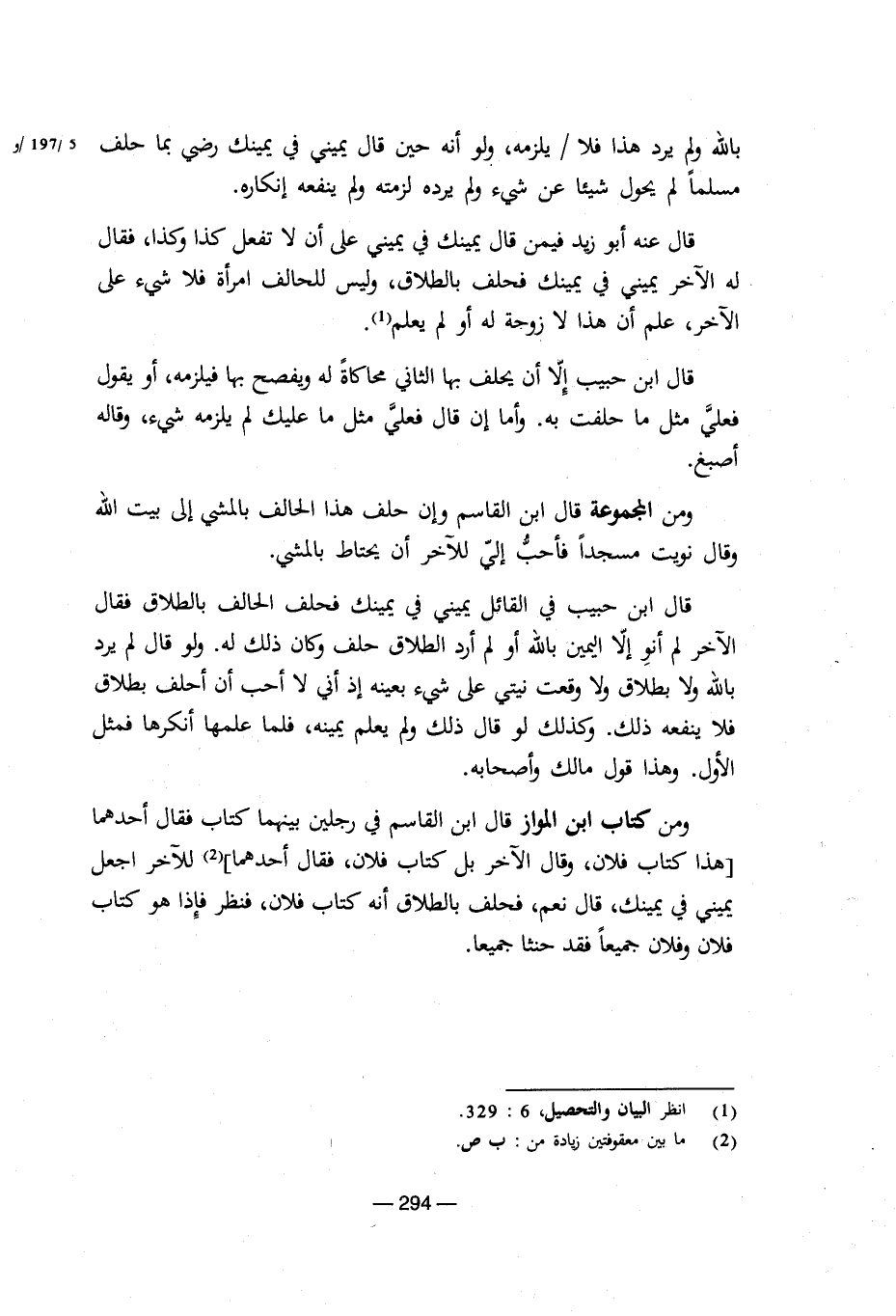 ومن كتاب ابن المواز قال ابن القاسم فى رجلين بينهما كتاب فقال أحدهما هذا كتاب فلان، وقال الآخر بل كتاب فلان، فقال أحدهما للآخر اجعل يمينى فى يمينك، قال نعم، فحلف بالطلاق أنه كتاب فلان، فنظر فإذا هو كتاب فلان وفلان جميعاً فقد حنث جميعا.