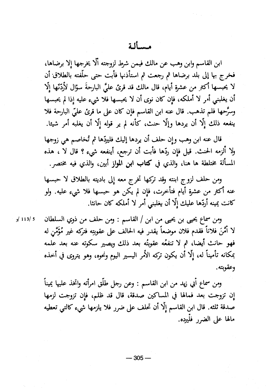 ومن سماع أبى زيد من ابن القاسم: وعن رجل طلق امرأته واتخذ عليها يميناً غن تزوجت بعد فمالها فى المكساكين صدقة، قال قد ظلم، فإن تزوجت لزمها صدقة ثلثه. قال ابن القاسم إلا أن تحلف على ضرر فلا يلزمها شىء كالتى تعطيه مالها على الضرر فليرده.