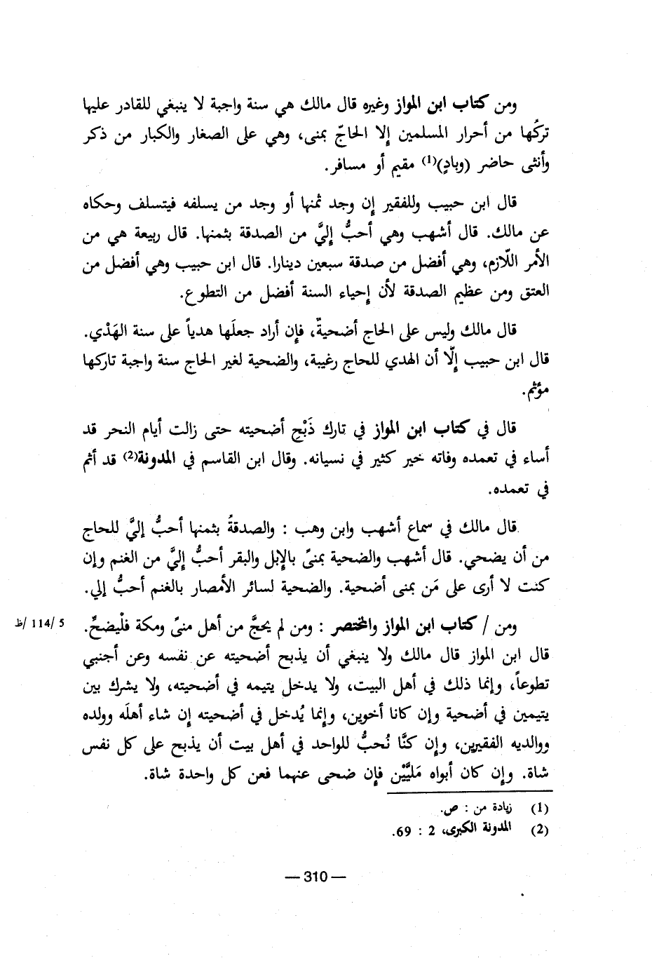 ومن كتاب ابن المواز وغيره قال مالك هى سنة واجبة لا ينبغى للقادر عليها تركها من أحرار المسلمين إلا الحاج بمعنى، وهى على الصغار والكبار من ذكر وأنثى حاضر وباد مقيم أو مسافر.