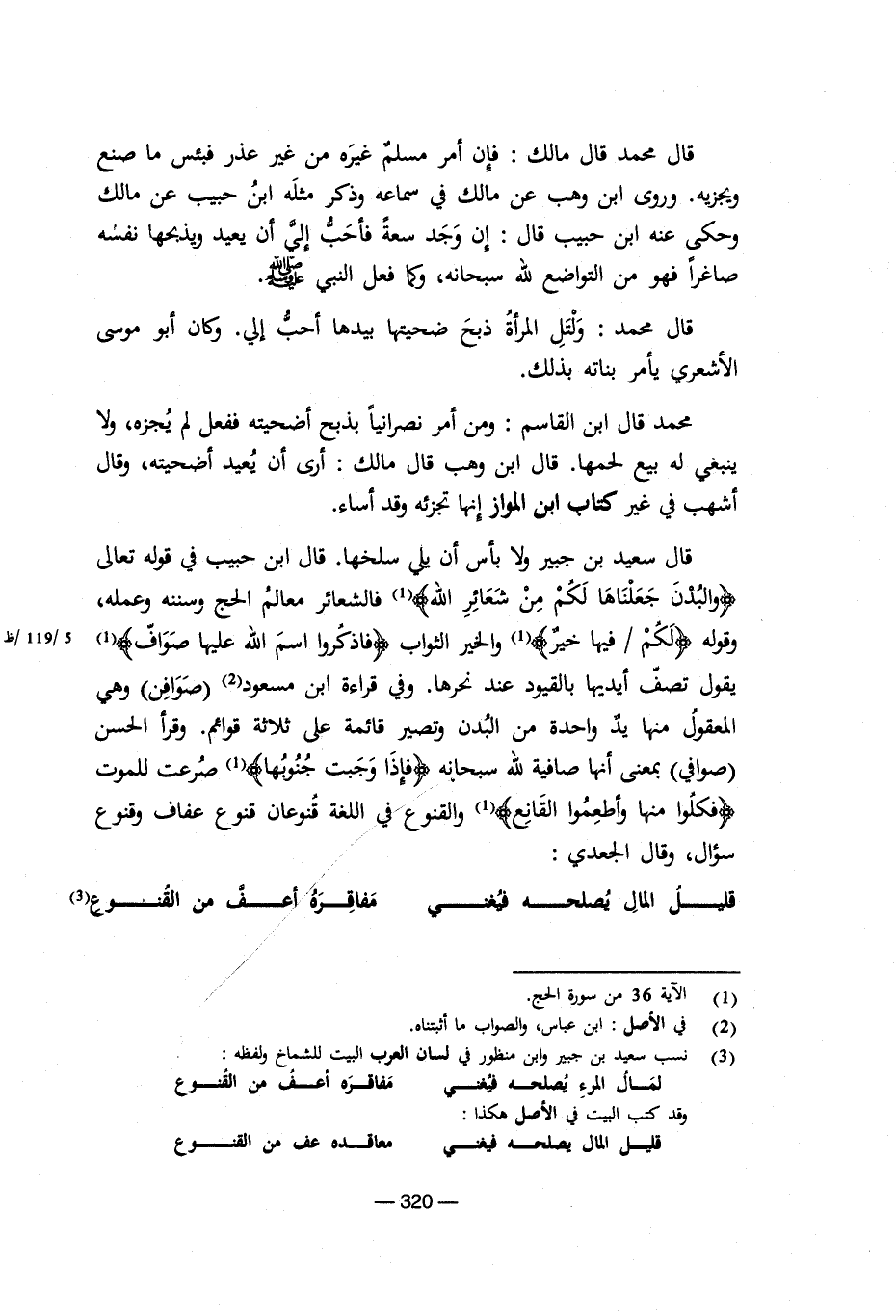 قال سعيد بن جبير ولا بأس أن يلى سلخها. قال ابن حبيب فى قوله تعالى (والبدن جعلناها لكم من شعائر الله) فالشعائر معالم الحج وسننه وعمله، وقوله (لكم فيها خير) والخير الثواب (فاذكروا اسم الله عليها صواف) يقول تصف أيديها بالقيود عند نحرها. وفى قراءة ابن مسعود صوافن وهى المعقول منها يد واحدة من البدن وتصير قائمة على ثلاثة قوائم. وقرأ الحسن صوافى بمعنى أنها صافية لله سبحانه (فإذا وجبت جنوبها) صرعت للموت (فكلوا منها وأطعموا القانع) والقنوع فى اللغة قنوعان قنوع عفاف وقنوع سؤال، وقال الجعدى: