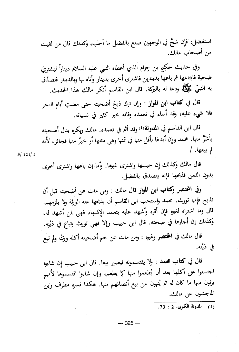 وفى المختصر وكتاب ابن المواز قال مالك: ومن مات عن أضحيته قبل أن تذبح فإنها تورث. محمد واستحب ابن القاسم أن يذبحها عنه الورثة ولا يلزمهم. قال وما اشتراه لغيره فإن أقره وأشهد عليه بتعمد الإشهاد فهى لمن أشهد له، وكذلك إن أجازها فى صحته. قال ابن حبيب وإلا فهى تورث وتباع فى دينه.