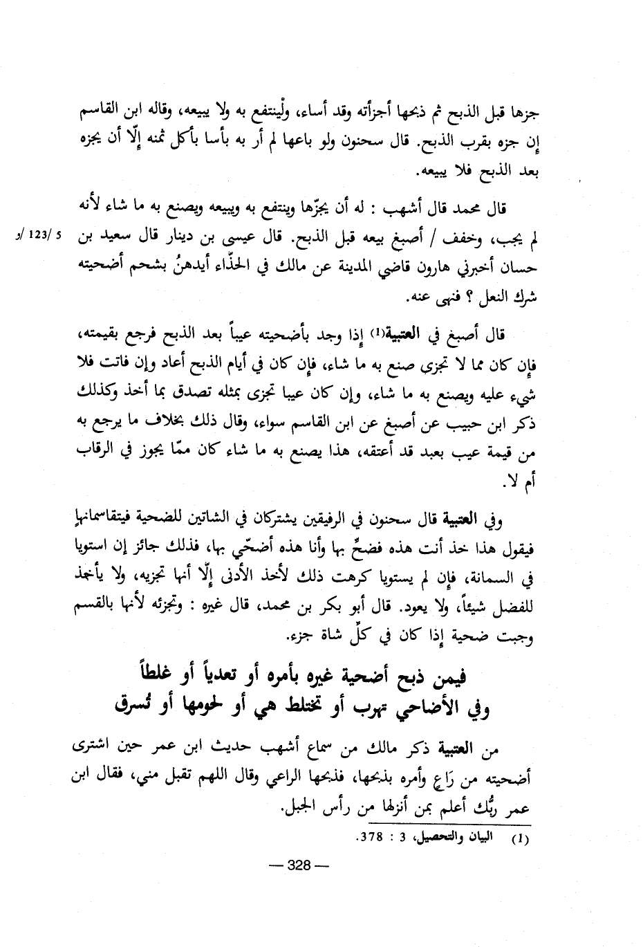 من العتبية ذكر مالك من سماع أشهب حديث ابن عمر حين اشترى أضحيته من راع وأمره بذبحها، فذبحها الراعى وقال اللهم تقبل منى، فقال ابن عمر ربك أعلم بمن أنزلها من رأس الجبل.