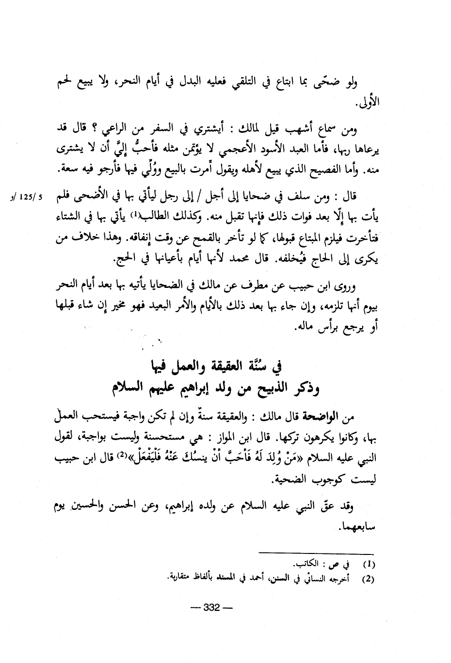 من الواضحة قال مالك: والعقيقة سنة وإن لم تكن واجبة فيستحب العمل بها، وكانوا يكرهون تركها. قال ابن المواز: هي مستحسنة وليست بواجبة، لقول النبي عليه السلام [من ولد له فأحب أن ينسك عنه فليفعل] قال ابن حبيب ليست كوجوب الضحية.