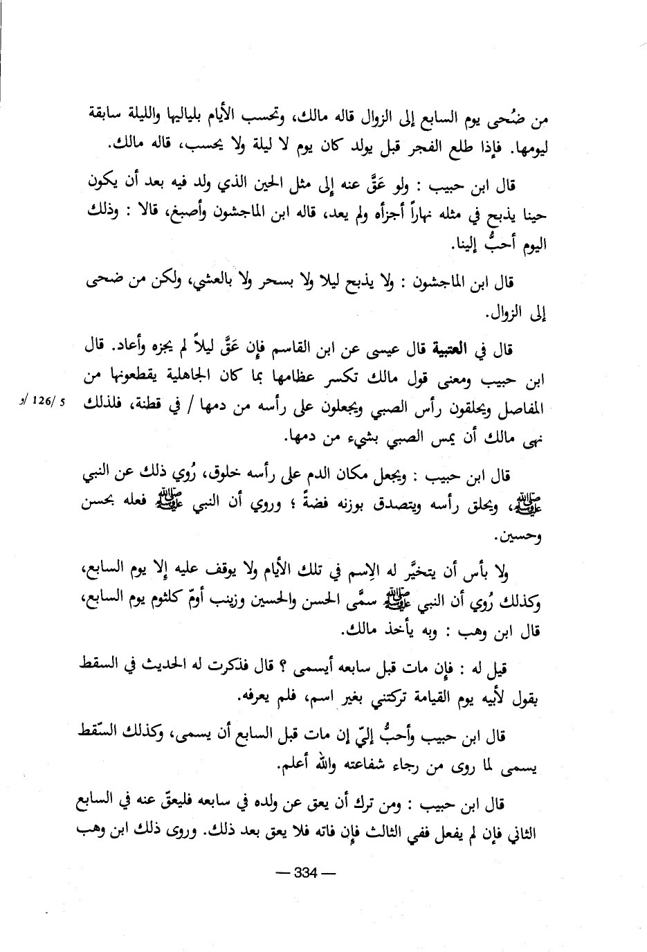 قال ابن حبيب: ولو عق عنه إلى مثل الحين الذي ولد فيه بعد أن يكون حينا يذبح في مثله نهارا ً أجزأه ولم يعد، قاله ابن الماجشون أصبغ، قالا: وذلك اليوم أحب إلينا.