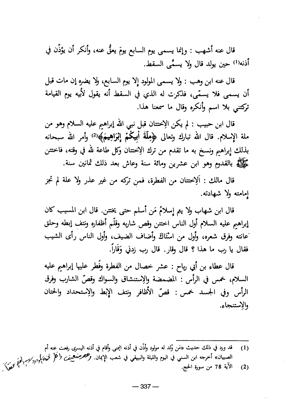 قال ابن شهاب ولا يتم إسلام من أسلم حتى يختتن. قال ابن المسيب كان إبراهيم عليه السلام أول الناس اختتن وقص شاربه وقلم أظفاره ونتف إبطه وحلق عانته وفرق شعره، وأول من استاك وأضاف الضيف، وأول الناس رأى الشيب فقال يارب ما هذا؟ قال وقار. قال رب زدني وقارا. قال عطاء بن أبي رباح: عشر خصال من الفطرة وفطر عليها إبراهيم علية السلام، خمس في الرأس: المضمضة والاستنشاق والسواك وقص الشارب وفرق الرأس وفي الجسد خمس: قص الأظافر ونتف الإبط والاستحداد والختان والاستنجاء.