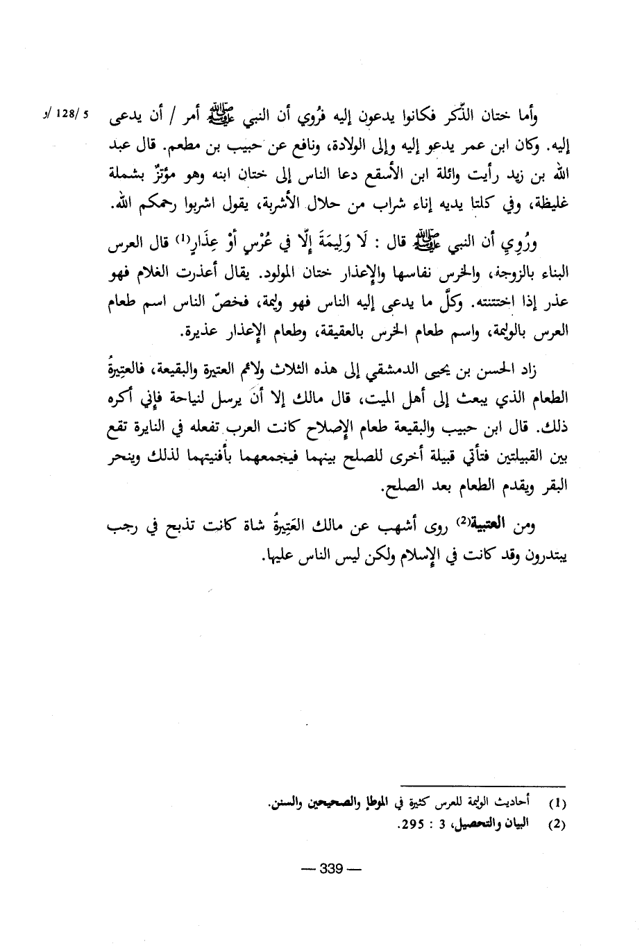 زاد الحسن بن يحيى الدمشقي إلى هذه ثلاث ولائم العتيرة والبقيعة، فالعتيرة الطعام الذي يبعث إلى أهل الميت، قال مالك إلا أن يرسل لنياحة فإني أكره ذلك. قال ابن حبيب والبقيعة طعام الإصلاح كانت العرب تفعله في النايرة تقع بين القبيلتين فتأتي قبيلة أخرى للصلح بينهما فيجمعهما بأفنيتهما لذلك وينحر البقر ويقدم الطعام بعد الصلح.