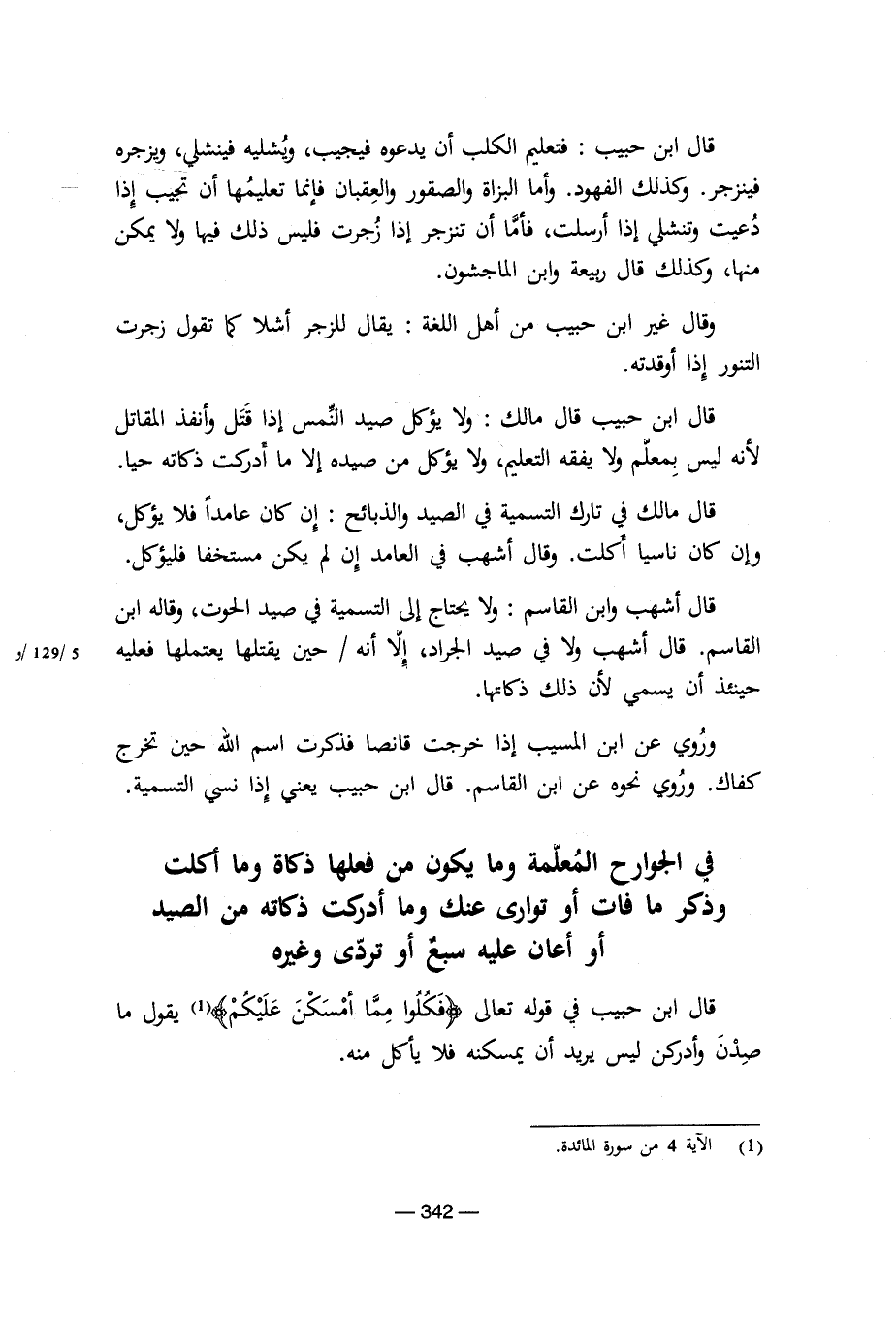 قال ابن حبيب في قوله تعالى {فكلوا مما أمسكن عليكم} يقول ما صدن وأدركن ليس يريد أن يمسكنه فلا يأكل منه.