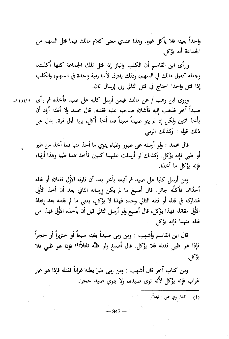 وروى ابن وهب عن مالك فيمن أرسل كلبه على صيد فأخذه ثم رأى صيداً آخر فذهب إليه فأشلاه صاحبه عليه فقتله. قال محمد ولا أظنه أراد أن يأخذ اثنين ولكن إذا لم ينو صيداً معيناً فما أخذ أكل، يريد أول مرة. يدل على ذلك قوله: وكذلك الرمي.
