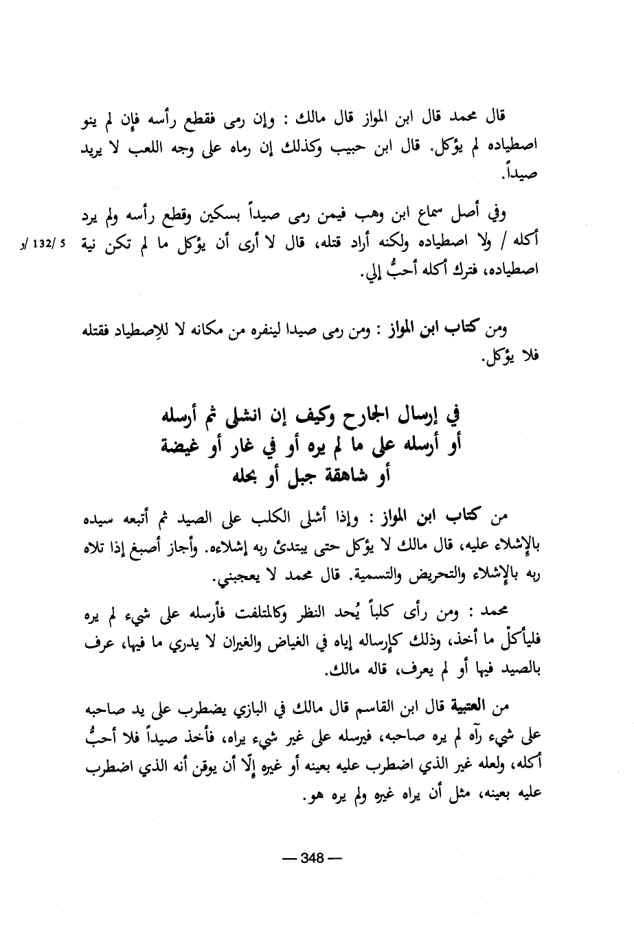 وفي أصل سماع ابن وهب فيمن رمى صيداً بسكين وقطع رأسه ولم يرد أكله ولا اصطياده ولكنه أراد قتله، قال لا أرى أن يؤكل مل لم تكن نية اصطياده، فترك أكله أحب إلي.