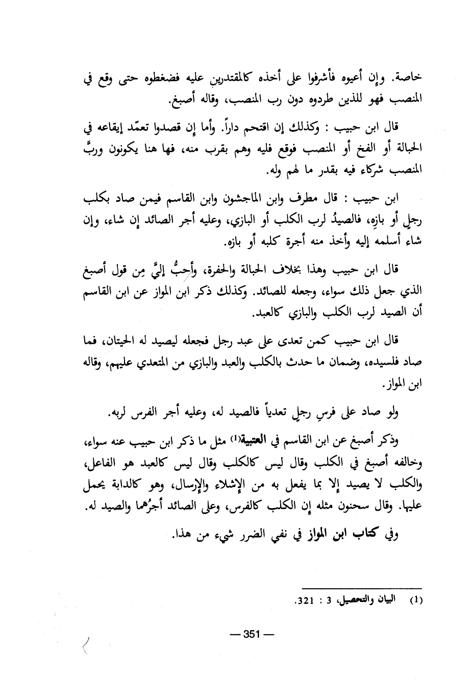 قال ابن حبيب وهذا بخلاف الحبالة والحفرة، وأحب إلي من قول أصبغ الذي جعل ذلك سواء، وجعله للصائد. وكذلك ذكر ابن المواز عن ابن القاسم أن الصيد لرب الكلب والبازي كالعبد.