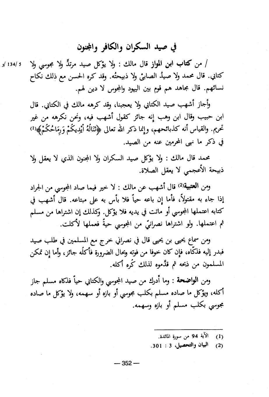 ومن الواضحة: وما أدرك من صيد المجوسي والكتابي حياً فذكاه مسلم جاز أكله، ويؤكل ما صاده مسلم بكلب مجوسي أو بازه أو سهمه، ولا يؤكل ما صاده مجوسي بكلب مسلم أو بازه وسهمه.