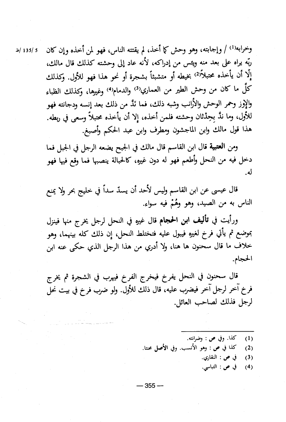 ورأيت في تأليف ابن الحجام قال غيره في النحل لرجل يخرج منها فينزل بموضع ثم يأتي فرخ لغيره فيبول عليه فتختلط النحل، أن ذلك كله بينهما، وهو خلاف ما قال سحنون ها هنا، ولا أدري حكى عنه ابن الحجام.