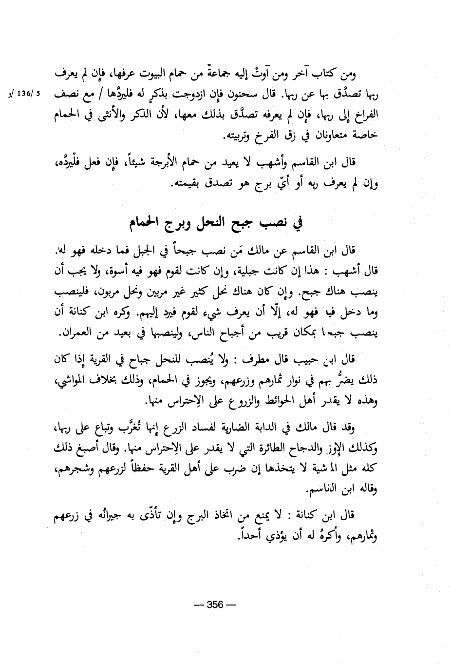 قال ابن حبيب قال مطرف: ولا ينصب للنحل جباح في القرية إذا كان ذلك يضر بهم في نوار ثمارهم وزرعهم، ويجوز في الحمام، وذلك بخلاف المواشي، وهذه لا يقدر أهل الحوائط والزروع على الاحتراس منها.