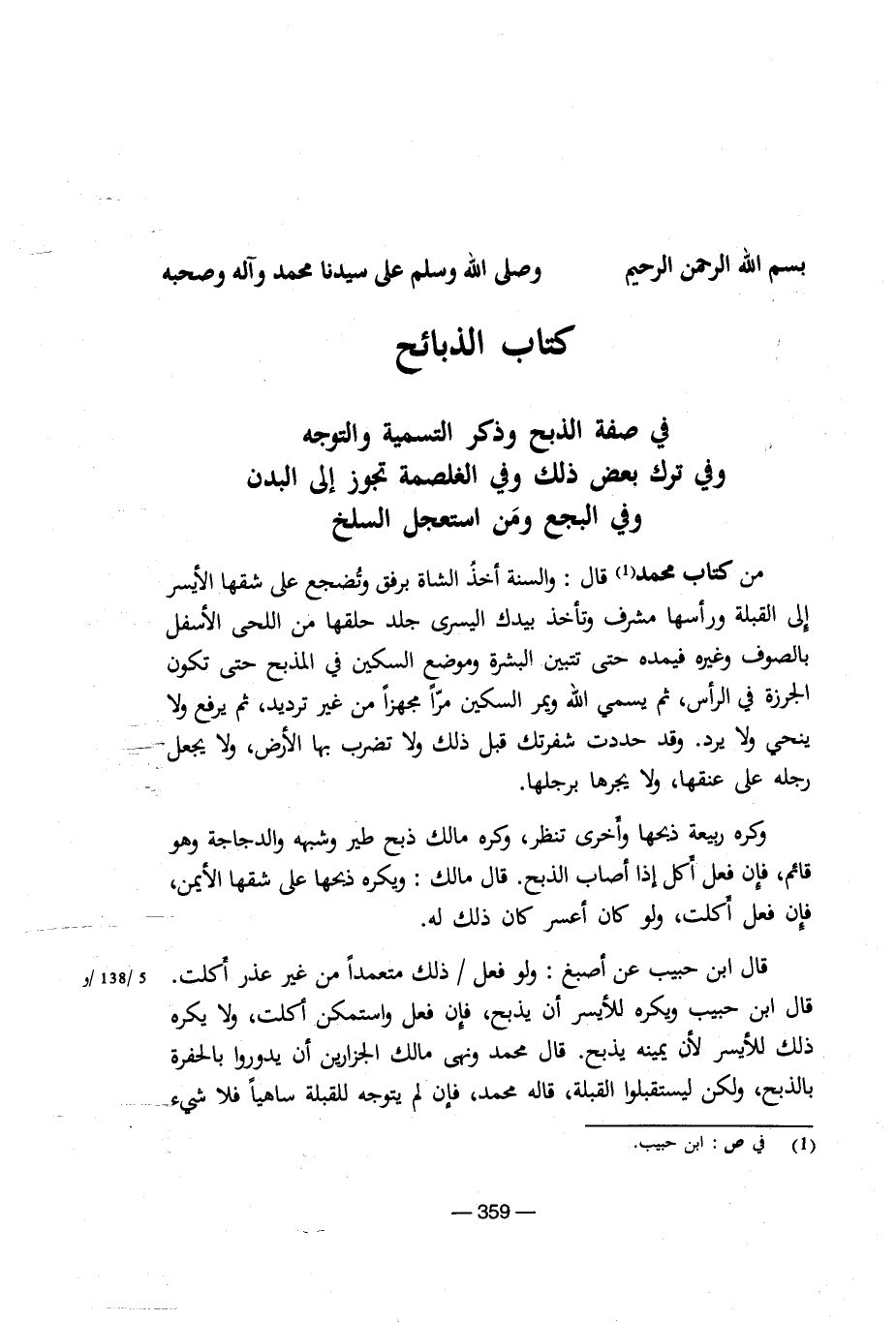 من كتاب محمد قال: والسنة أخذ الشاة برفق وتضجع على شقها الأيسر إلى القبلة ورأسها مشرف وتأخذ بيدك اليسرى جلد حلقها من اللحي الأسفل بالصوف وغيره فيمده حتى تتبين البشرة وموضع السكين في المذبح حتى تكون الجرزة في الرأس، ثم يسمي الله ويمر السكين مرا مجهزا من غير ترديد، ثم يرفع ولا ينحى ولا يرد. وقد حددت شفرتك فبل ذلك ولا تضرب بها الأرض، ولا يجعل رجله على عنقها، ولا يجرها برجلها.