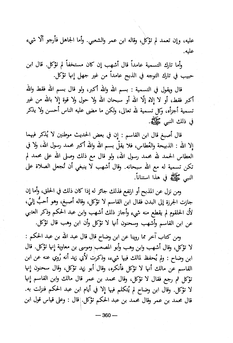 قال أصبغ قال ابن القاسم: إن في بعض الحديث موطنين لا يذكر فيهما إلا الله: الذبيحة والعطاس، فلا يقل بسم الله والله أكبر محمد رسول الله، ولا في العطاس الحمد لله محمد رسول الله، ولو قال مع ذلك وصلى الله على محمد لم تكن تسمية له مع الله سبحانه. وقال أشهب لا ينبغي أن تجعل الصلاة على النبي صلي الله عليه وسلم في هذا استنانا.