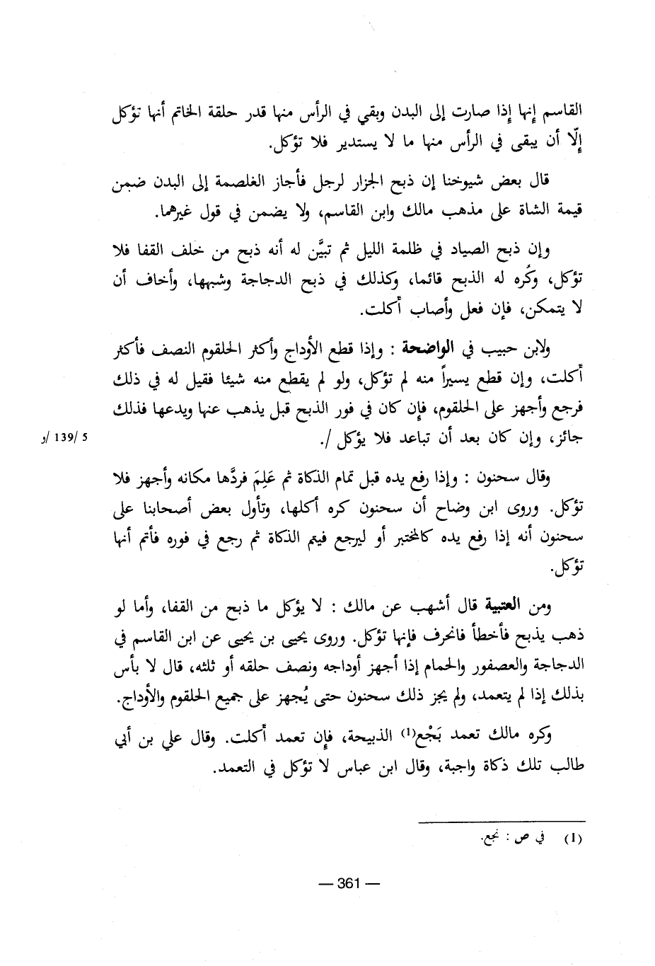 ومن العتبية قال أشهب عن مالك: لا يؤكل ما ذبح من القفا، وأما لو ذهب يذبح فأخطأ فانحرف فإنها تؤكل. وروى يحيى بن يحيى عن ابن القاسم في الدجاجة والعصفور والحمام إذا أجهز أوداجه ونصف حلقه أو ثلثه، قال لا بأس بذلك إذا لم يتعمد، ولم يجز ذلك سحنون حتى يجهز على جميع الحلقوم والأوداج.