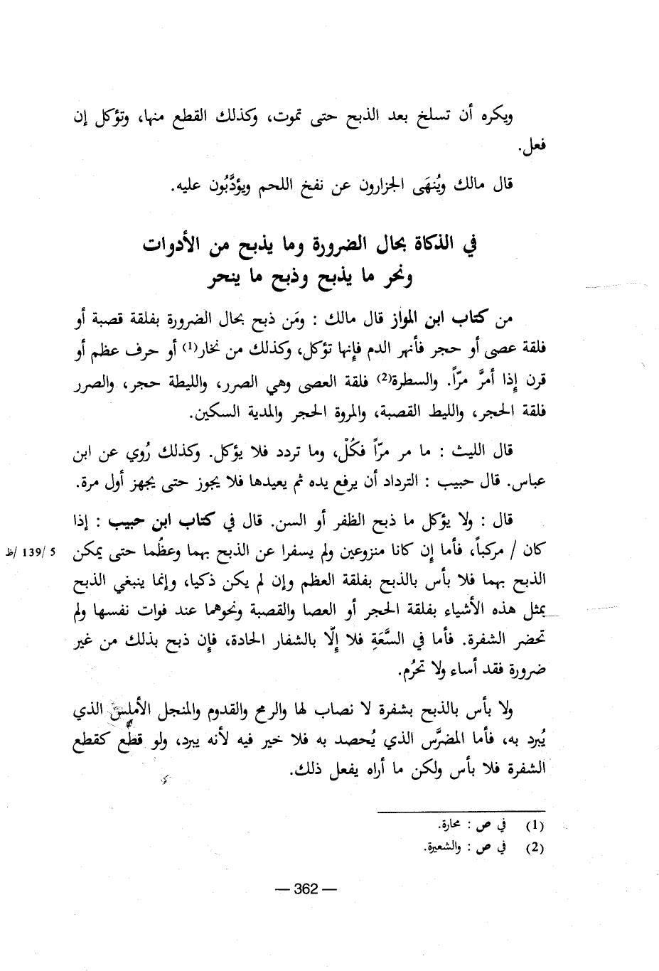 من كتاب ابن المواز قال مالك: ومن ذبح بحال الضرورة بفلقة قصبة أو فلقة عصا أو حجر فأنهر الدم فإنها تؤكل، وكذلك من نخار أو حرف عظم أو قرن إذا أمر مراً والسطرة فلقة العصا وهي الصرر، والليطة حجر، والصرر فلقة الحجر، والليط القصبة، والمروة الحجر والمدية السكين.