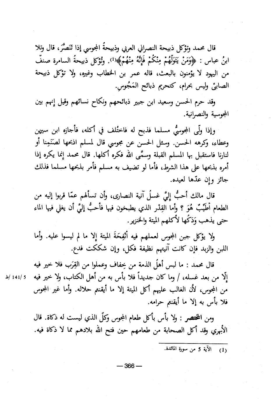 قال محمد وتؤكل ذبيحة النصراني العربي والمجوسي إذا تنصر، قال وتلا ابن عباس {ومن يتولهم منكم فإنه منهم} وتؤكل ذبيحة السامرة صنف من اليهود لا يؤمنون بالبعث، قاله عمر بن الخطاب وغيره، ولا تؤكل ذبيحة الصابئ وليس بحرام، كتحريم ذبائح المجوس.
