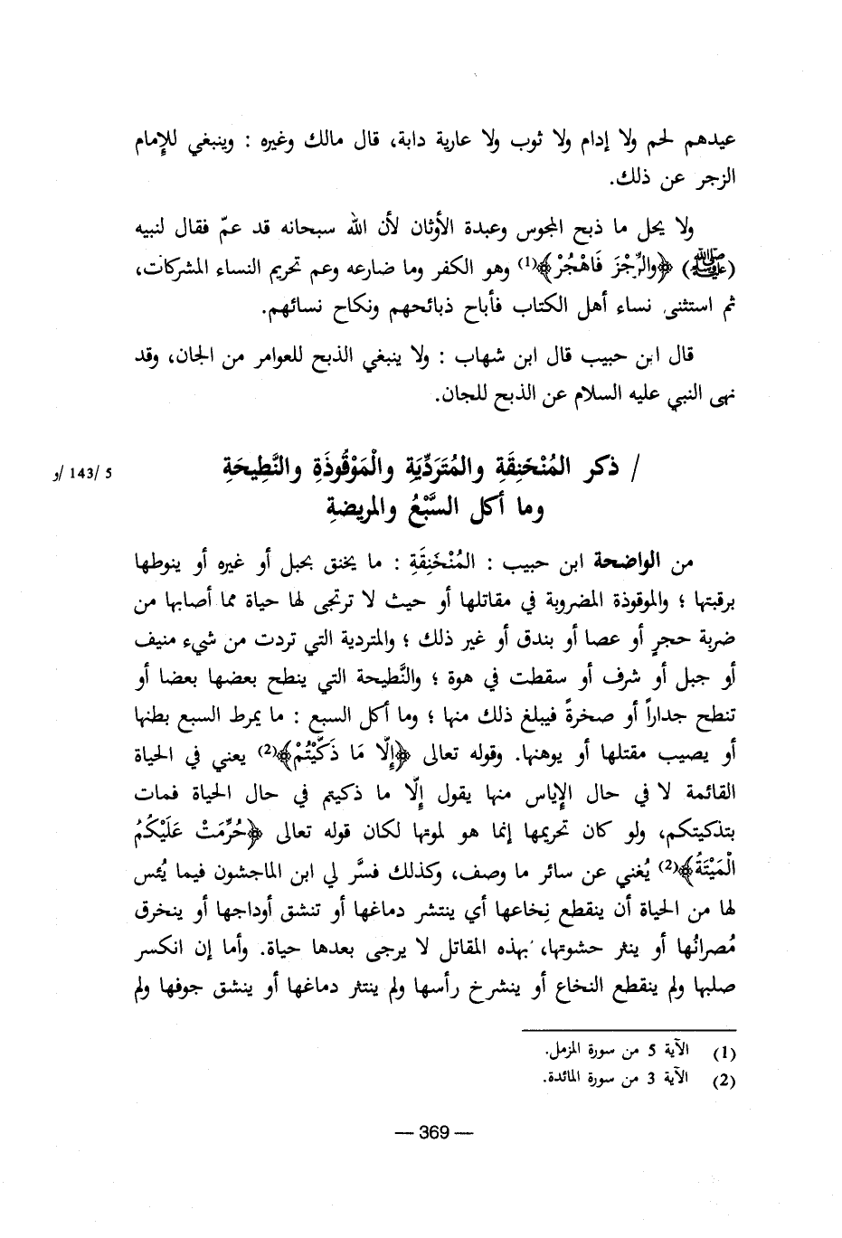 من الواضحة ابن حبيب: المنخنقة: ما يخنق بحبل أو غيره أو ينوطها برقيتها، والموقوذة المضروبة في مقاتلها أو حيث لا ترتجى لها حياة مما أصابها من ضربة حجر أو عصا أو بندق أو غير ذلك، والمتردية التي ترد من شيء منيف أو جبل أو شرف أو سقطت في هوة، والنطيحة التي ينطح بعضها بعضا أو تنطح جداراً أو صخرةً فيبلغ ذلك منها، وما أكل السبع: ما يمرط السبع بطنها أو يصيب مقتلها أو يوهنها. وقوله تعالى {إلا ما ذكيتم} يعني في الحياة القائمة لا في حال الإياس منها يقول إلا ما ذكيتم في حال الحياة فمات بتذكيتكم، ولو كان تحريمها إنما هو لموتها لكان قوله تعالى {حرمت عليكم الميتة} يغني عن سائر ما وصف، وكذلك فسر لي ابن الماجشون فيما يئس لها من الحياة أن ينقطع نخاعها أي ينتشر دماغها أو تنشق أوداجها أو ينخرق مصرانها أو ينثر حشوتها، بهذه المقاتل لا يرجى بعدها حياة. وأما إن انكسر صلبها ولم ينقطع النخاع أو ينشرخ رأسها ولم ينتثر دماغها أو ينشق جوفها ولم