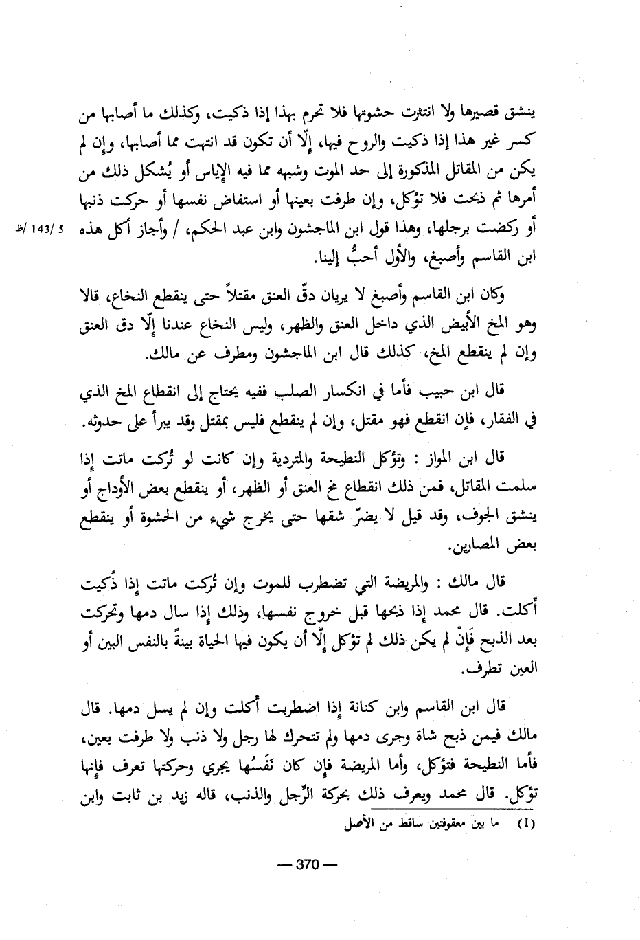 وكان ابن القاسم وأصبغ لا يريان دق العنق مقتلا حتى ينقطع النخاع، قالا وهو المخ الأبيض الذي داخل العنق والظهر، وليس النخع عندنا إلا دق العنق وإن لم ينقطع المخ كذلك قال ابن الماجشون ومطرف عن مالك.
